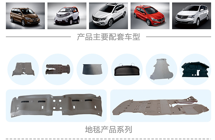 公司產(chǎn)品配套項目涵蓋轎車、MPV、SUV、新能源電動車領(lǐng)域。公司主要參評有汽車頂棚、隔音墊、地毯、大型注塑件、橡膠制品、EPP泡沫等車內(nèi)飾品件。